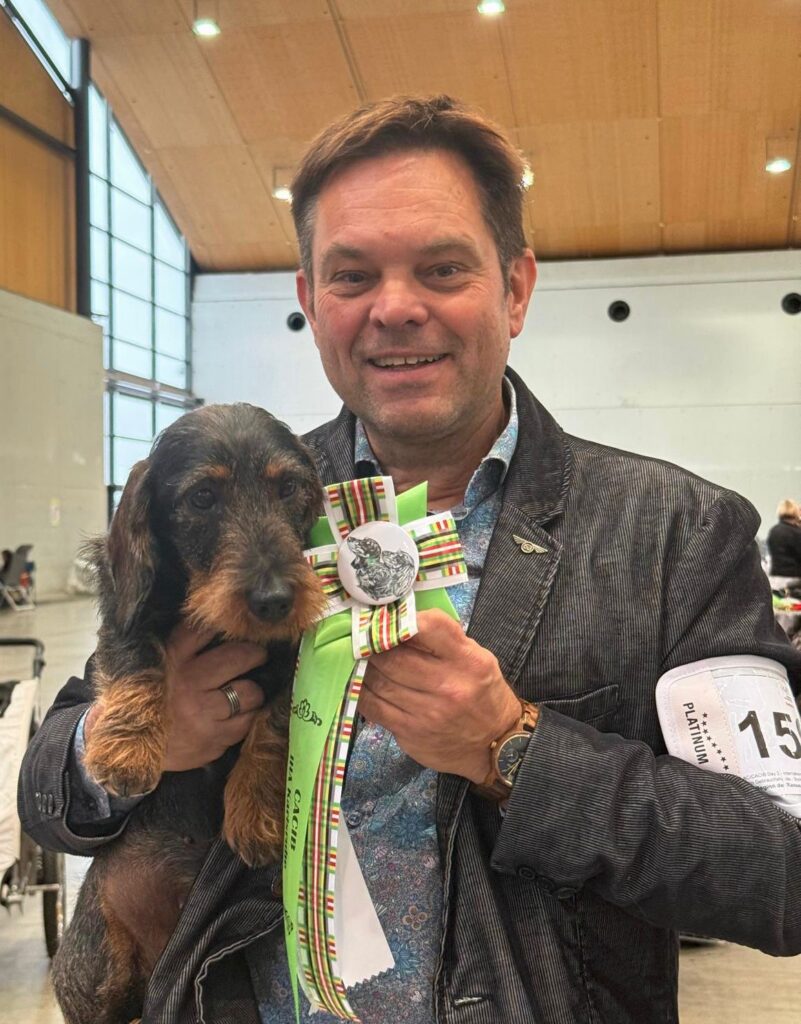 Die Richterin Frau Bandel macht ihn zum schönsten Rauhhaarteckel der Ausstellung und er erhält dafür das BOB!