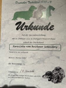Am 04.02.2024 wird unsere Lotta (Xara Lotta vom Reichauer Schlossberg) zur schönsten Jugendhündin der Aussgelltung gekürt!